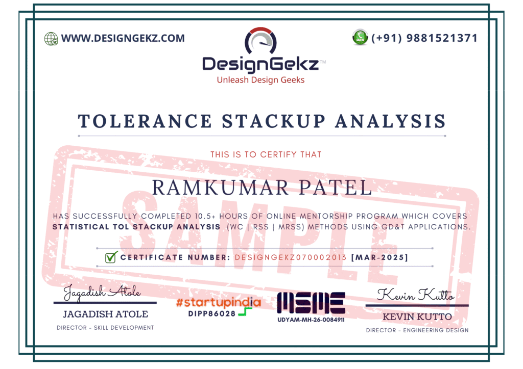 DesignGekz® Academy certified Tolerance Stackup Analysis (Worst Case + Root Sum Square + Modified Root Sum Square mrthods) and Engineering Fits (ISO 286), mentorship program in Live + 24×7 online mode is one of the most in demand certification programs covers application oriented case studies of tlerance stackup analysis.
