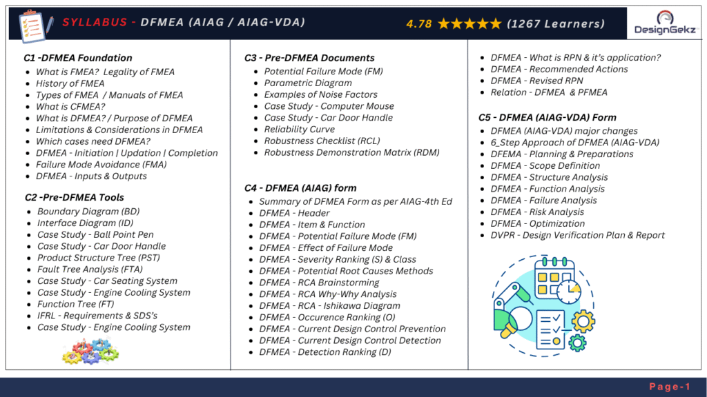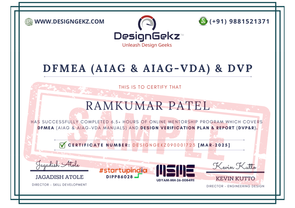 DesignGekz® Academy certified “Design Failure Mode & Effect Analysis (DFMEA) + DVP&R” online certification program in Live + 24×7 online mode is one of the most in demand training program which covers DFMEA concepts as per AIAG & AIAG-VDA manuals.