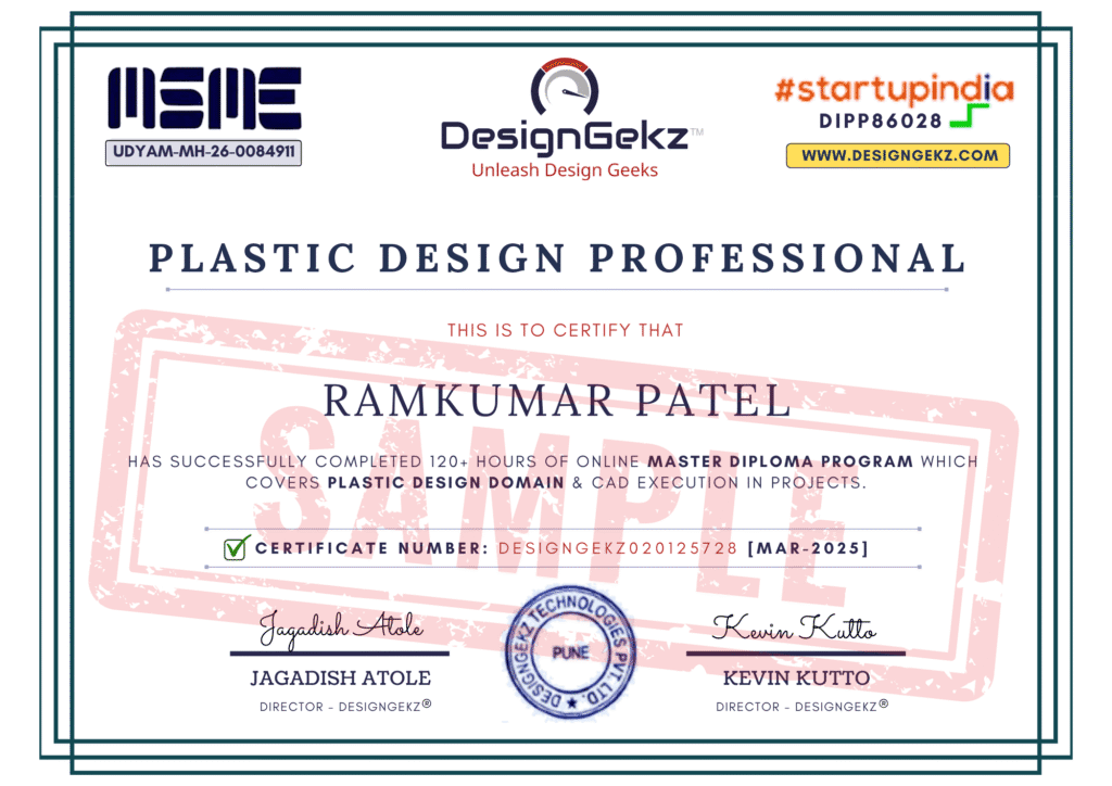 As part of Master Diploma in Plastic and Sheetmetal Design Professional (PSDP) Program, you earn 7 certificates for each skill based course like Plastic Domain, Sheetmetal Domain, NPD and NPI, GD&T (Basic and Pro), Tolerance Stack-up analysis, DFMEA (AIAG-VDA), PPAP (AIAG).