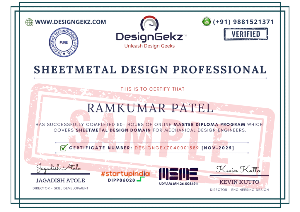 ➥ Designgekz certified – Master Diploma in “Sheetmetal Design Professional (SMDP)” offers “Concrete Framework & Plan of 6 Months in Live (Daily 1 Hour) & 24×7 Online Mode” which has been tested and proven to prepare talented design engineers like you with every aspect of sheetmetal design domain, dimensioning and tolerancing and critical design processes to successfully deliver robust functional product which is required to succeed in the mechanical design industry.
